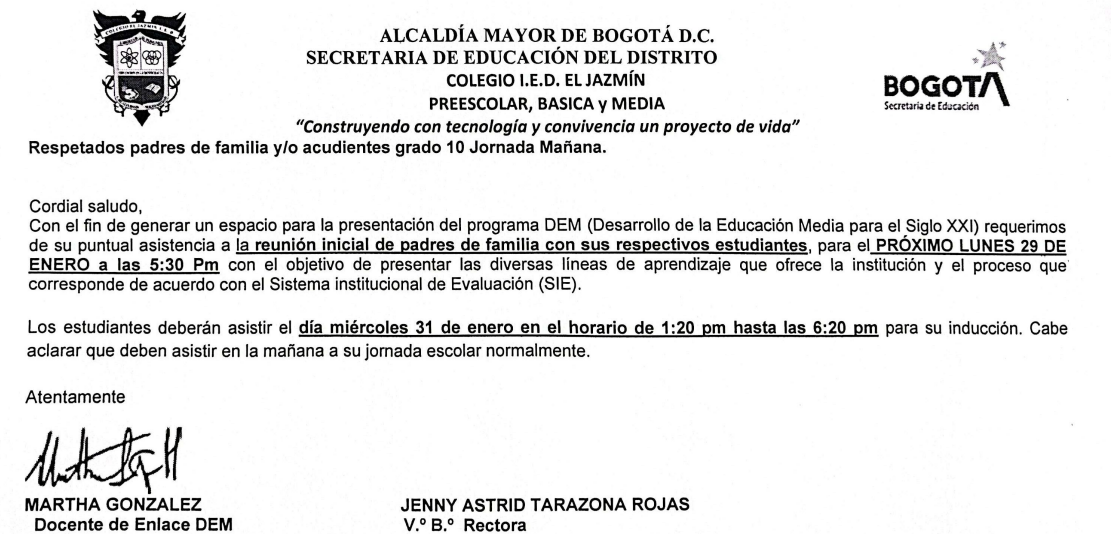 Lunes 29 de enero 5:30 pm Reunion con PADRES DE FAMILIA de estudiantes grado 10°JM