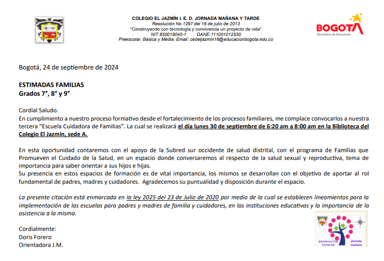 ESCUELA DE PADRES 7°,8°,9° SEPTIEMBRE 30 HORA 6:20 AM