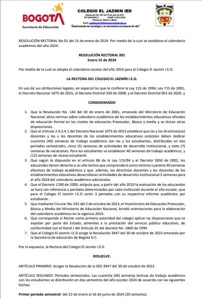 RESOLUCIÓN RECTORAL No 01 del 15 de enero de 2024. Por medio de la cual se establece el calendario académico del año 2024. DESCARGAR ARCHIVO>>>