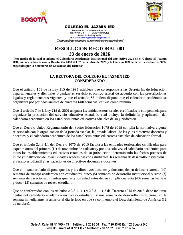 RESOLUCIÓN RECTORAL 001 DE 2025 PARA CRONOGRAMA ESCOLAR HORARIOS, FECHAS IMPORTANTES